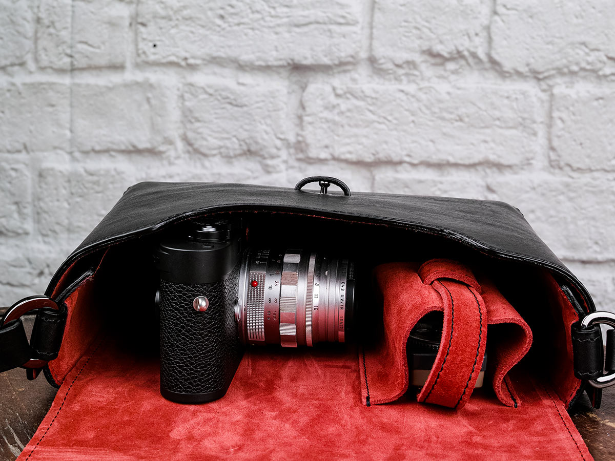 Key features: Full leather, inner lining in top red suede leather, leather belt, and shoulder pad, inner pockets for lenses and memory cards, batteries, light meters, etc.